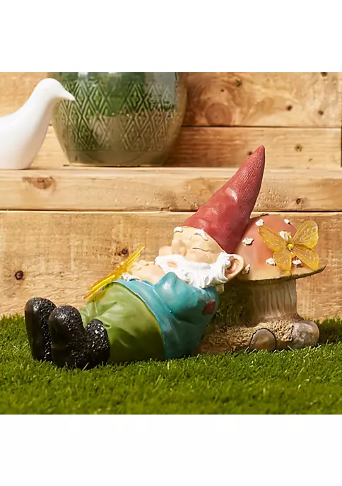 This little gnome is taking a nap in the sun so he can glow at night. This charming classic gnome is resting against a mushroom. Powered by a solar cell that soaks up the sun’s rays, so when the sun goes down, the butterflies light up. Perfect for your front yard, garden, or patio. 2.2 pounds. 13 x 5.5 x 8 inches tall. Polyresin and plastic.
